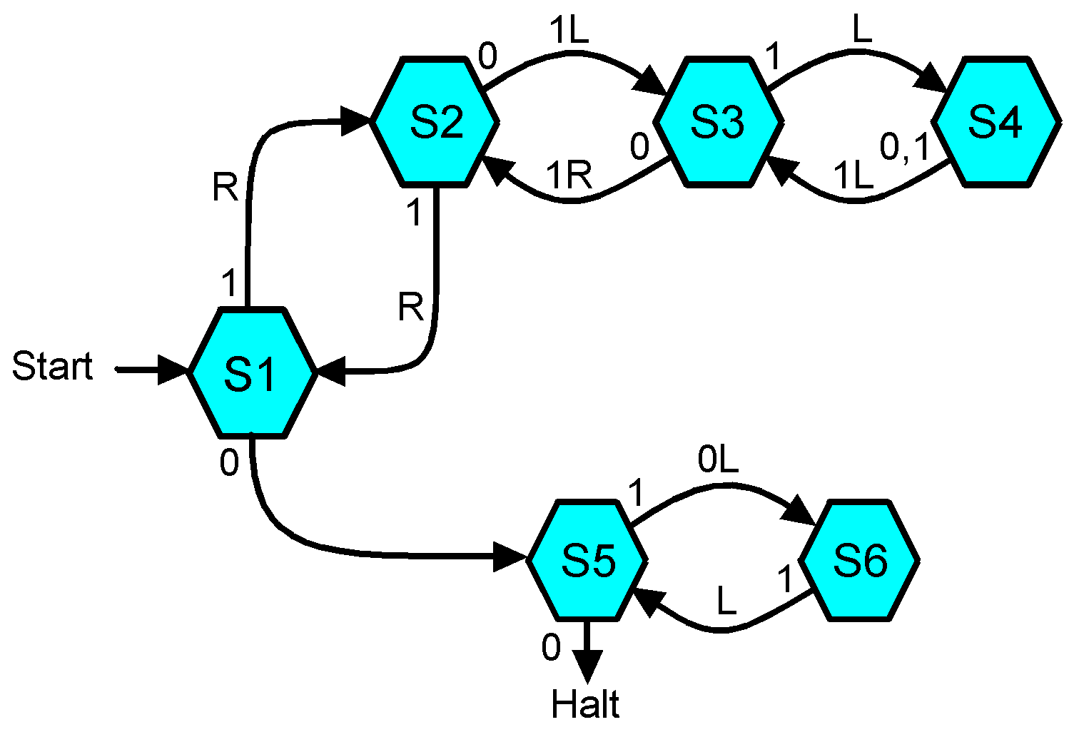 A Turing Machine (TM) For The Universal Turing Machine (UTM) This machine duplicates a string of "10" symbols. It is a two symbol version of the program in the Finite State Machine of the Turing Machine in Conway's Game of Life which doubled string of symbol "1". The following state transition diagram describes the machine. The symbol at the foot of the arrow is that under the read/write head and the symbols part way along are; the one to write (if different) and the direction of movement of the head.